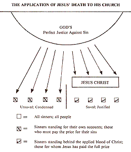 When true believers are freely justified, this does not mean that God forgets, overlooks, or passes by, their sins. Every sin they commit must be fully paid. All the sins of God's people are paid for by way of substitution. The infinite payment of Jesus Christ is applied to their accounts. This truth is pictured in the sketch below. ![]() include "../doctrineincs/regufont.html"; ?> Prior to the Passover night in Egypt, the Israelites were required to kill a lamb with no blemish, without breaking any of its bones, The blood from this lamb was to be placed upon the doorposts of their homes. When the angel of death passed through the land that night, only the first born who were behind the blood of the lamb were spared. The rest of the firstborn died. include "../doctrineincs/regufont.html"; ?> To whom does the lamb point? What does the blood of the lamb picture? How does this scene portray justification by application of Christ's blood? |