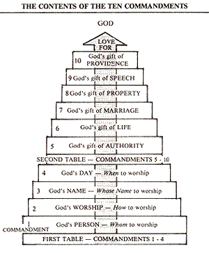We believe the Protestant division of the Ten Commandments to be the most accurate biblically, for the following reasons: include "../doctrineincs/regufont.html"; ?>1. It maintains as commandments only those that are clearly worded as commands. 2. It retains the marked difference between believing in false gods and worshipping through the use of images. 3. It preserves the commandment against covetousness as one command, as supported by Exodus 20: 17, Romans 7:7, and Romans 13:9. God's moral law is divided into two tables. The first table includes Commandments One through Four which emphasize our need to love God through directly worshipping Him. The second table contains Commandments Five through Ten which emphasizes our need to reveal love to God through showing love and concern for others. The core teaching contained in each commandment described in the sketch below and the chart on the following page. ![]() |