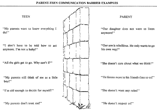 While teens tend to eagerly and confidently desire more freedom, to run ahead on the trail of life, their parents are generally more cautious. Parents realize that their teens are not as independent as they might think; that they rely upon them, as parents, more than they realize, expecting three meals, clean clothes, and a comfortable home each day. Having hiked many of life's trails, parents realize more of the possible dangers along the way - the power of peer pressure, wrong friends, and sinful temptation. include "../doctrineincs/regufont.html"; ?>From a spirit of genuine love and concern, parents will want to caution their teenagers, to hold them back, to slow them down, to warn them about the various possible dangers to be faced on the trail ahead. include "../doctrineincs/regufont.html"; ?>It is a lack of understanding the opposing tendencies of the self-confident, freedom-seeking teen and the cautious, possible problem-seeing parent which often produces tension in the teen years. When misunderstandings of this nature become established, communication barriers grow, as displayed in the sketch below. |