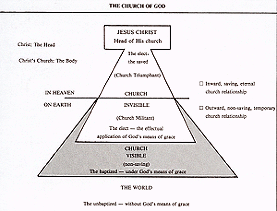 The following diagram distinguishes the Church Invisible (both Militant on earth and Triumphant in heaven) from the Visible on earth. The same inward and outward distinctions can be made when referring to the Covenant of Grace relationships |