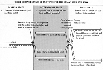 body on earth, a dead and decaying body, and an eternal resurrected body. The only persons who will not experience an intermediate state of soul and death of the body will be those who will be living on earth when Jesus returns on the clouds of heaven, and the resurrection takes place. Of such Paul writes, "Behold I show you a mystery; We shall not all sleep, but we shall all be changed, in a moment, in the twinkling of an eye, at the last trump" (I Corinthians 15:51-52a). |